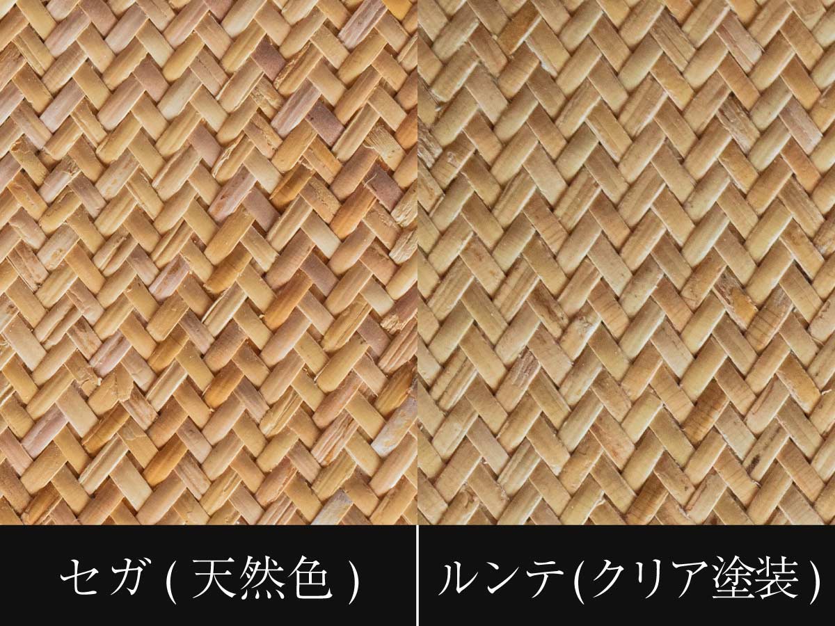 セガには琺瑯(ほうろう)質という乳白色半透明の硬質組織が表面にあり、硬くて光沢のある見事な艶を持っています。主にインドネシアの山岳地帯で群生している種類で、太さ3mm~15mmの蔓が高い木に巻きつきながら成長していきます。硬くて丈夫なこの素材は古来より高級な家具や敷物に使われてきました。天然のまま高級感のある艶を持っているので良い籐敷物というは質の良いセガのことを指すことが多いです。