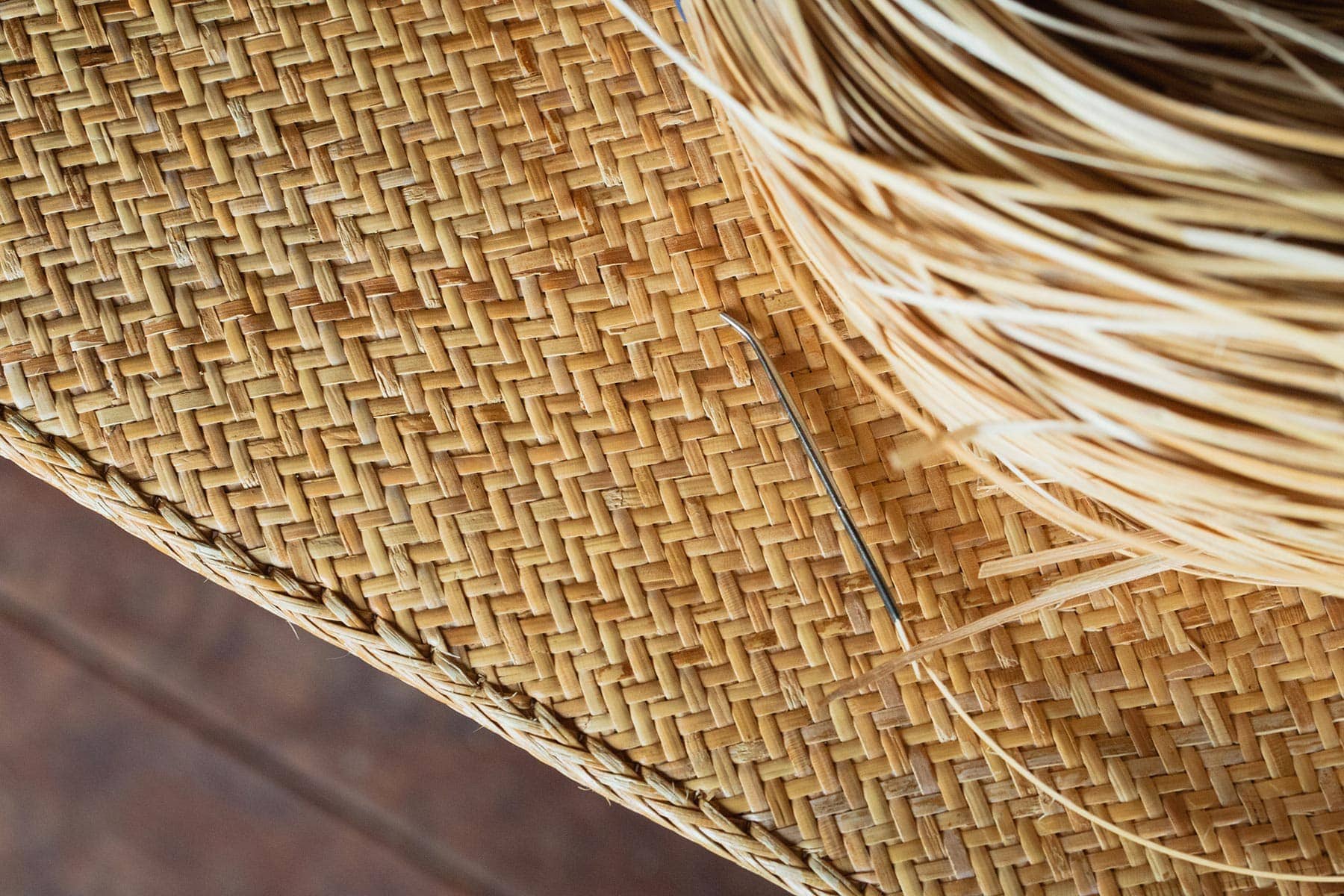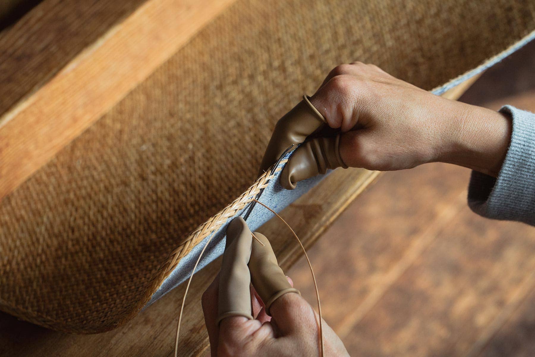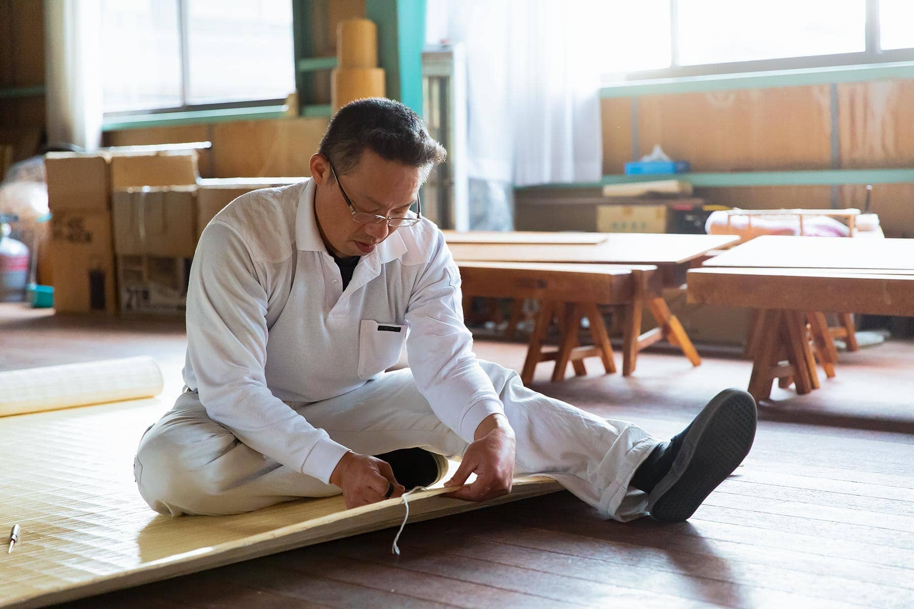 昔の籐むしろで一番よいとされていたのは35穴(191cmの中に35本の糸が通している穴)でした。近年39穴・41穴といったものが出ていますが、糸の数を増やすと糸と糸の通る穴が近づき繋がりやすく、表皮と身の部分が裂けやすくなります。当店では、昔から守られている「35穴がちょうどいい」という思いで籐むしろはすべて35穴にし、昔ながらのいいものを追求しようと考えています。